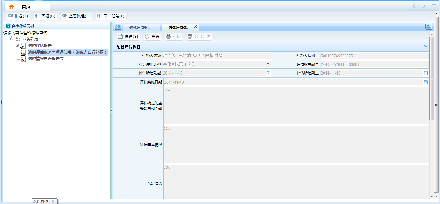 纳税评估执行角色根据处理建议选择需自行更正补税的,从多事件打开发送自行补正通知书,录入补正期限、问题描述,保存→启动文书送达回证。